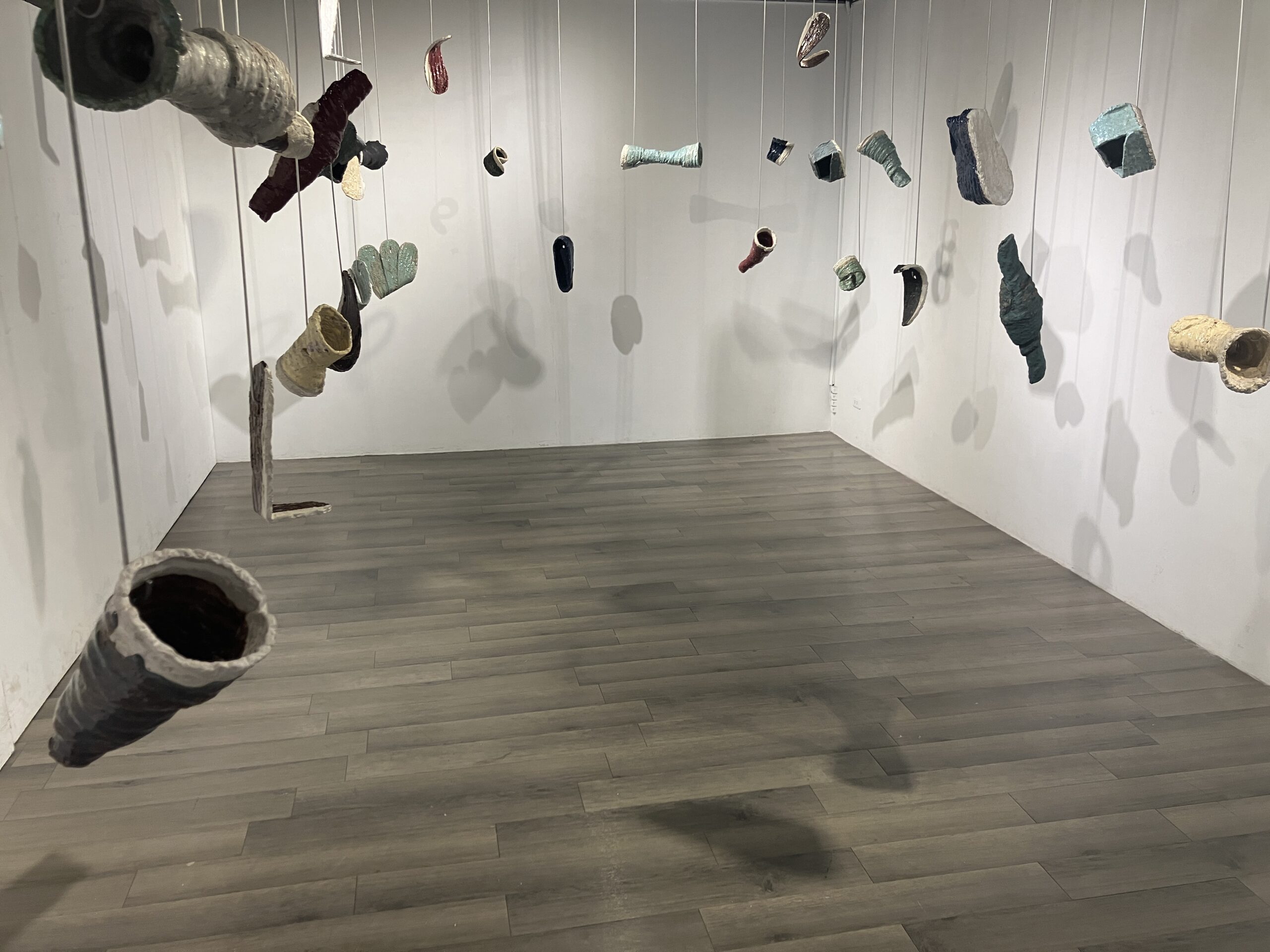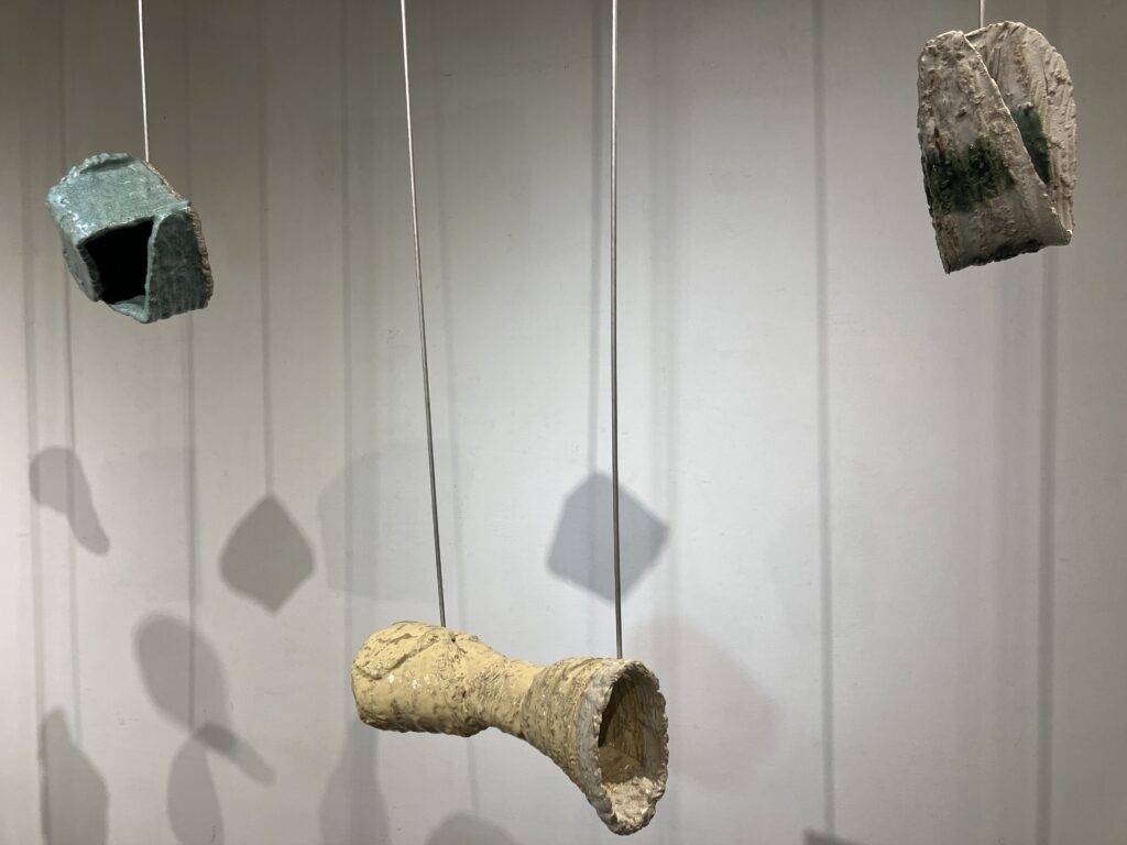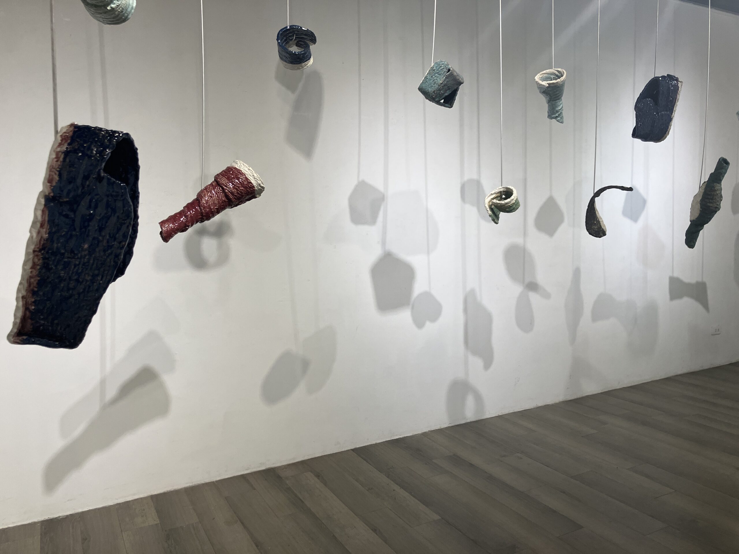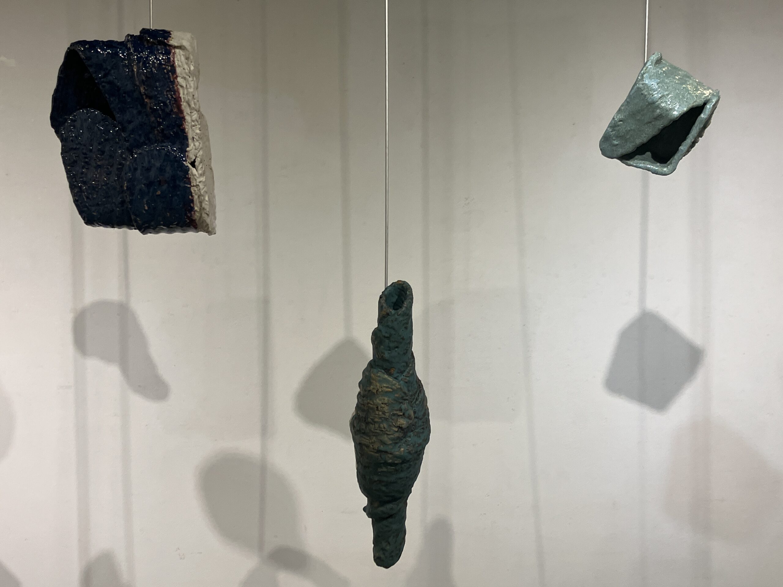 Though aluminum has featured in several exhibitions, it has not played such an important role since round hole square peg (2010). As in braceros (2014, 2015), the ceramics float on wire. As in silos (2015, 2018), the ceramics are offered up on hooks, available to the audience. Suspended, shadowed artworks by Christian Boltansky, Nishikawa Yuko, & Mark di Suvero are influences for this series. Following Paul Klee’s famous remark that a drawing is a line that went for a walk, ceramics is a line that went for a flight.
