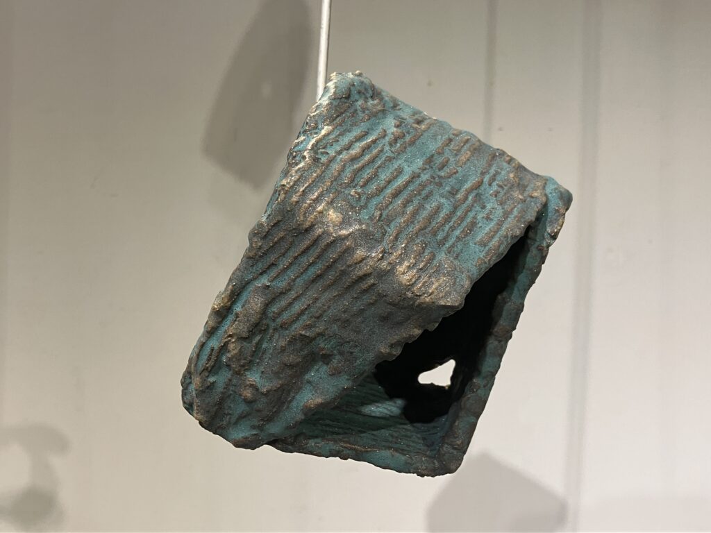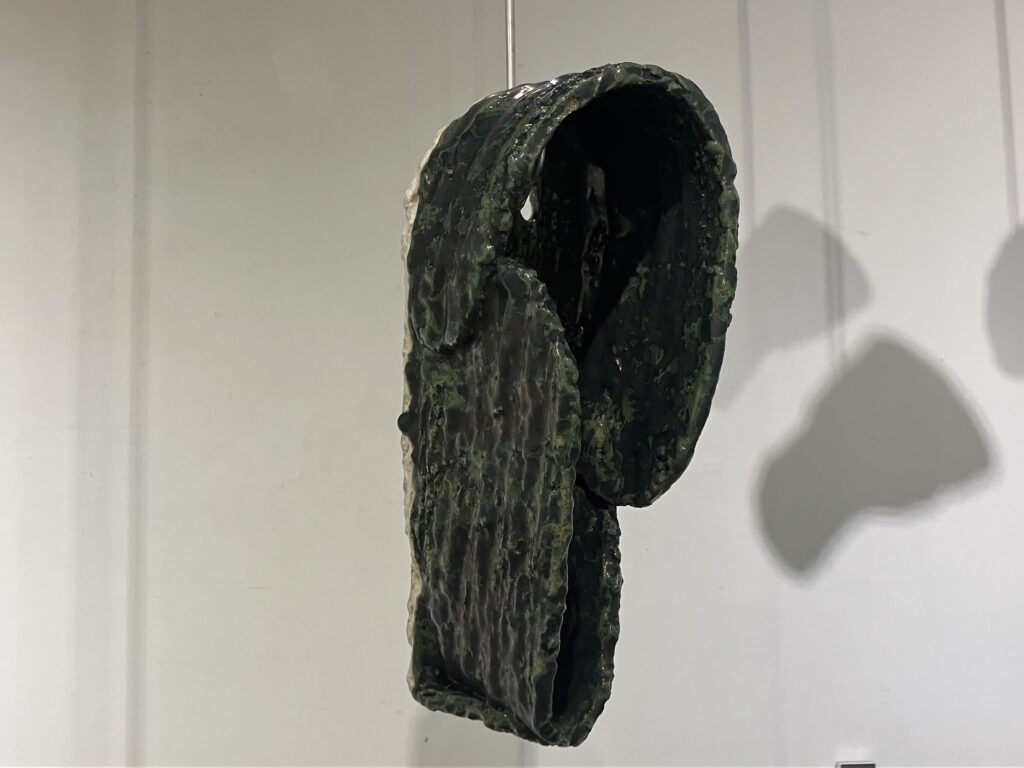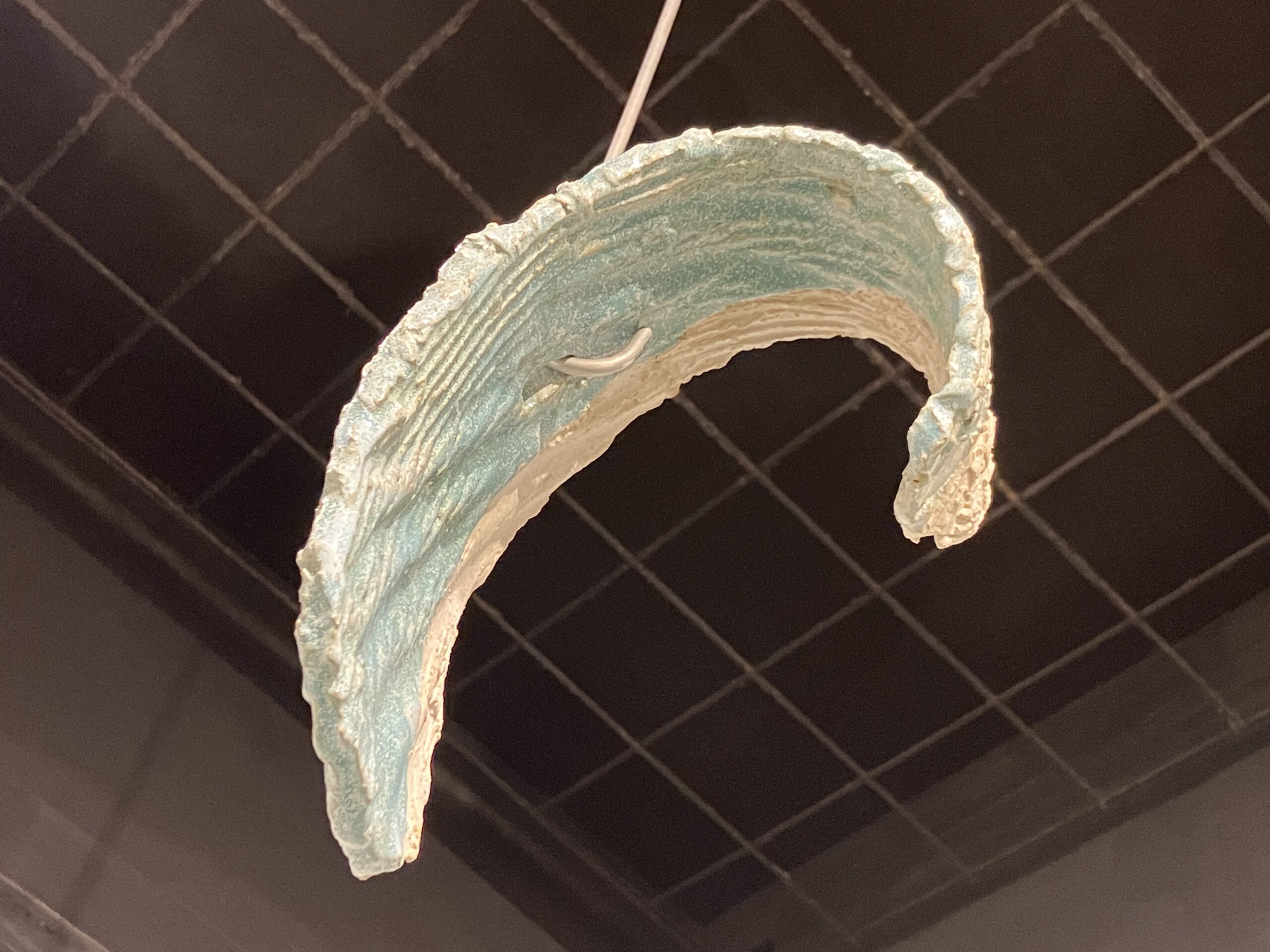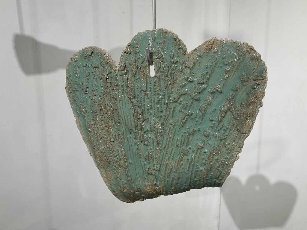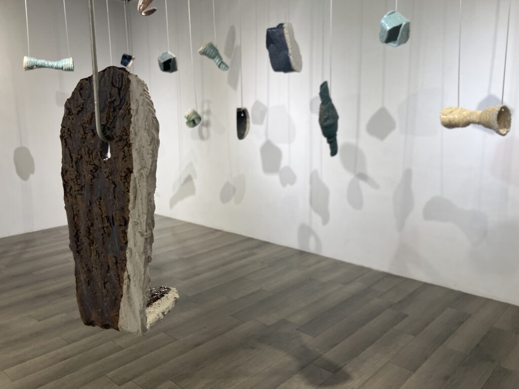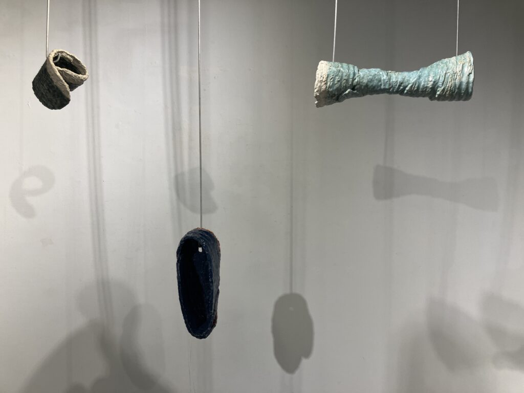 Though aluminum has featured in several exhibitions, it has not played such an important role since round hole square peg (2010). As in braceros (2014, 2015), the ceramics float on wire. As in silos (2015, 2018), the ceramics are offered up on hooks, available to the audience. Suspended, shadowed artworks by Christian Boltansky, Nishikawa Yuko, & Mark di Suvero are influences for this series. Following Paul Klee’s famous remark that a drawing is a line that went for a walk, ceramics is a line that went for a flight.